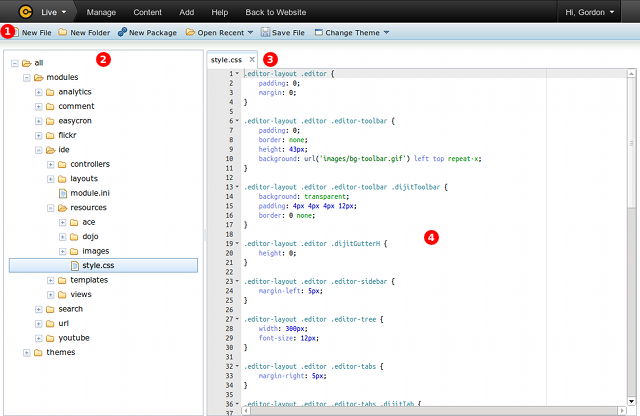 The optional IDE module provides an interface to edit theme or module files via your browser. This is useful when you only have browser-based access to Perforce Chronicle. This module needs to be enabled before you can use it. Please see Section 19.3, “Enabling and Disabling Modules” for more details. Also, the web server user needs to have write access to the files in the "sites" folder within your Chronicle installation in order to save any changes made.